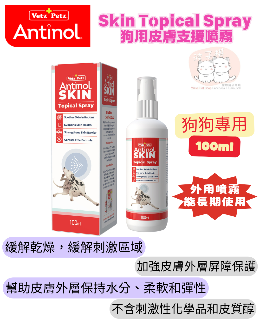 使用Antinol®狗用皮膚支援噴霧為您的狗狗提供應有的日常護理。 這種溫和的、受獸醫信任的配方旨在平息輕微刺激,保持水分,並加強皮膚外層的自然防禦。