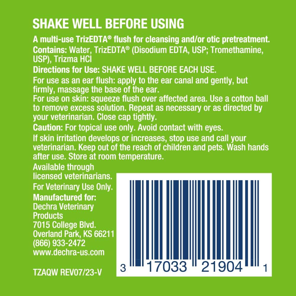 A multicleanse TrizEDTA solution. For use in dogs and cats as a cleaning and/or alkalinizing and/or pretreatment solution. Can be used without other meds or if used with antibiotic ear meds apply 1/2 hour before the antibacterial medication is applied. Aids in breakdown of inflammatory discharge in ears with more effective use of the antibiotic used for treating the infection.