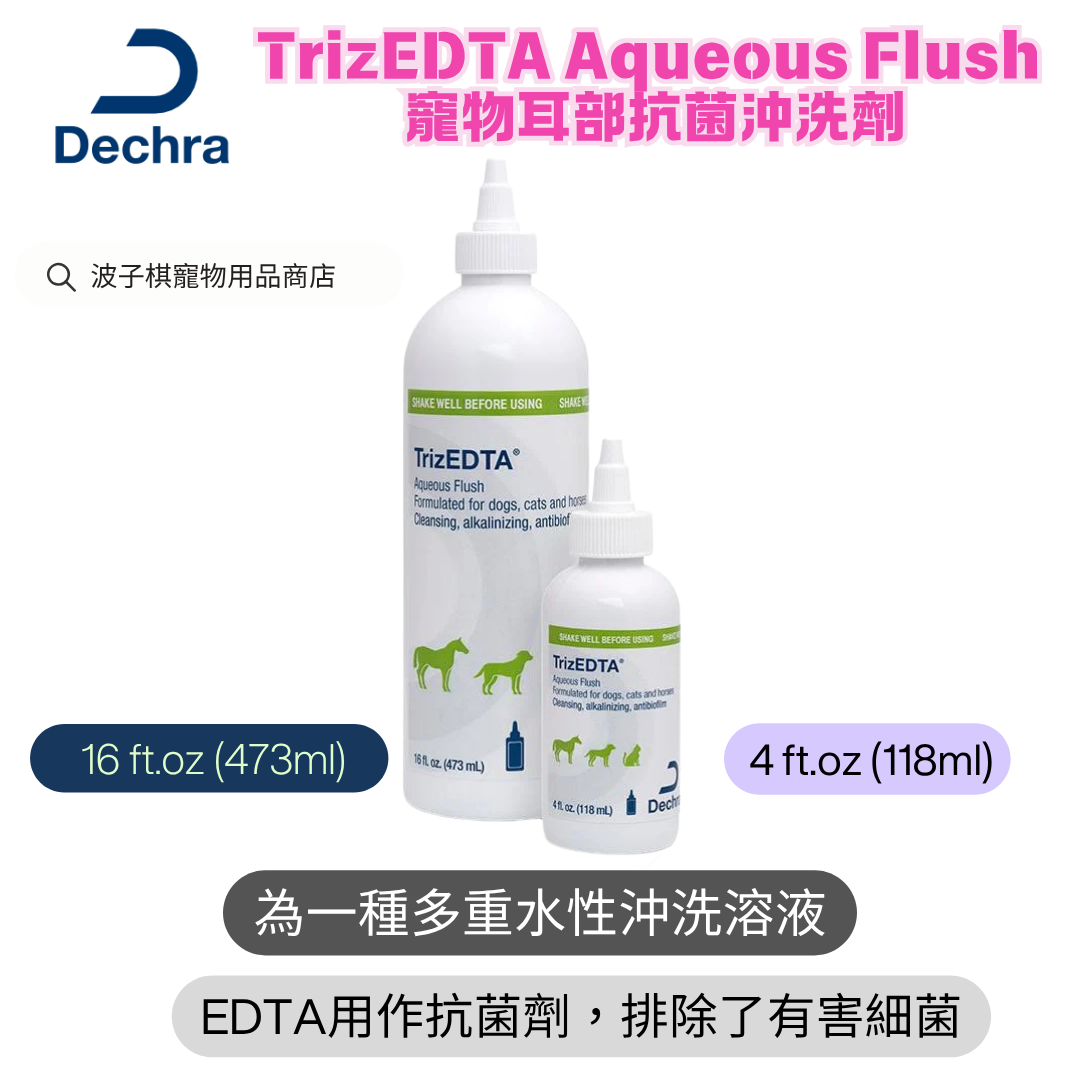 Dechra TrizEDTA 寵物抗菌沖洗劑為一種多重水性沖洗溶液,局部應用於貓狗的皮膚及耳朵,以提供清潔及抗菌用途。 此產品的EDTA用作抗菌劑,排除了有害細菌,同時還抑制進一步擴散。