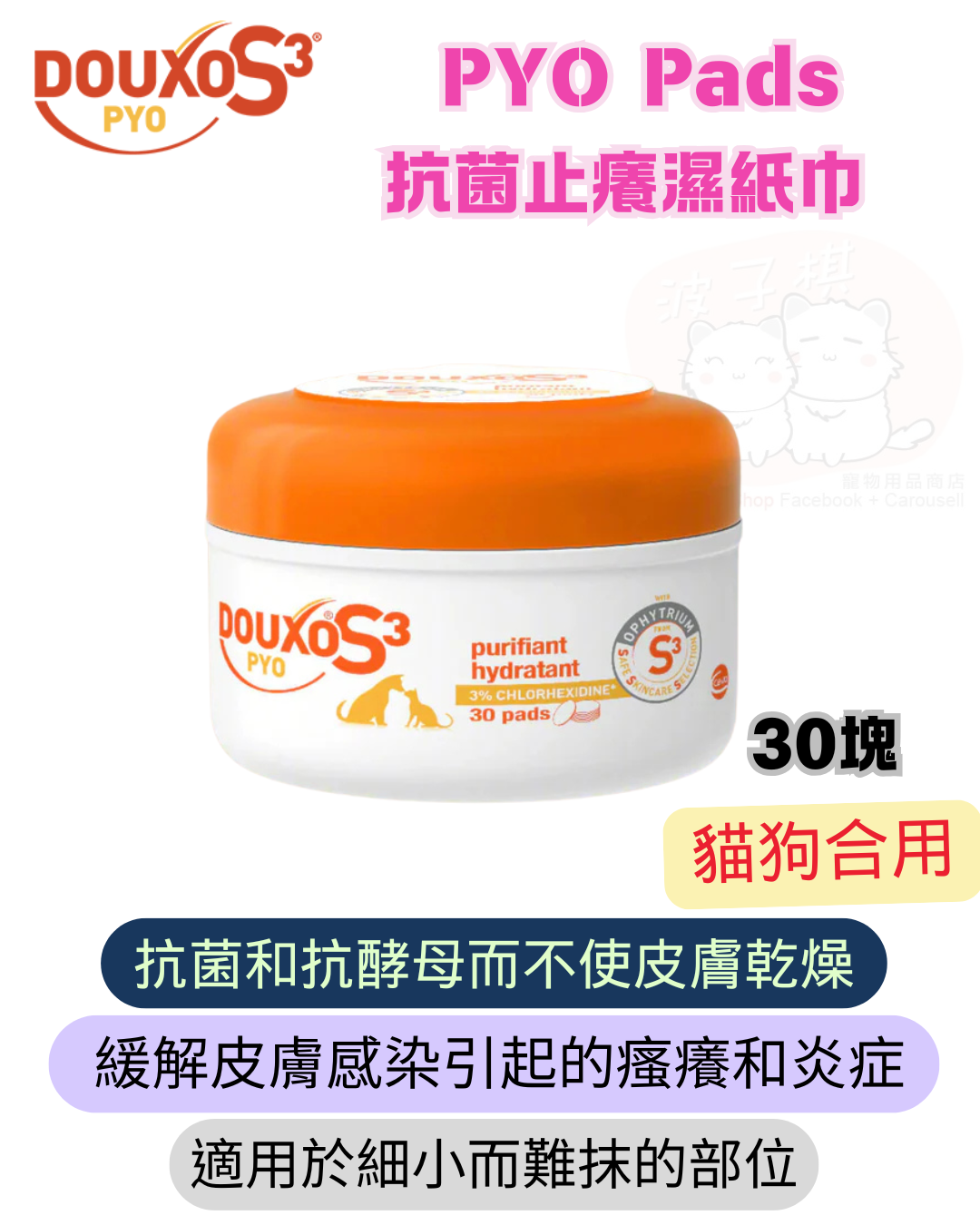 濕紙巾方便快捷。適用於細小而難抹的部位,不要清洗。也可以與Douxo S3 Pyo洗毛液及摩絲配合一起使用。
