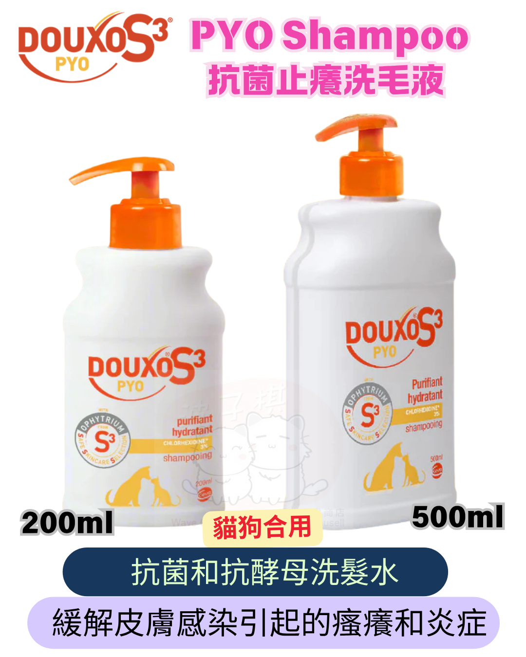Douxo S3 PYO專為貓狗設計用於皮膚毛髮,控制及消除瘙癢,恢復皮膚屏障和調節與這些病症有關的炎症與皮膚感染相關的細菌和真菌群。它不含肥皂,並含有溫和的清潔劑和保濕劑。