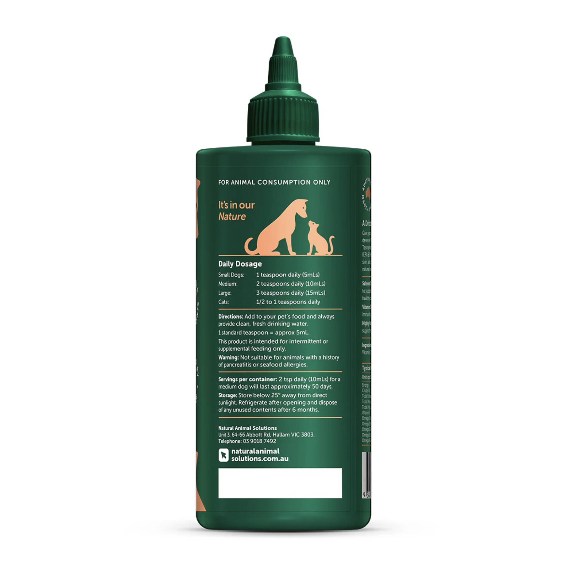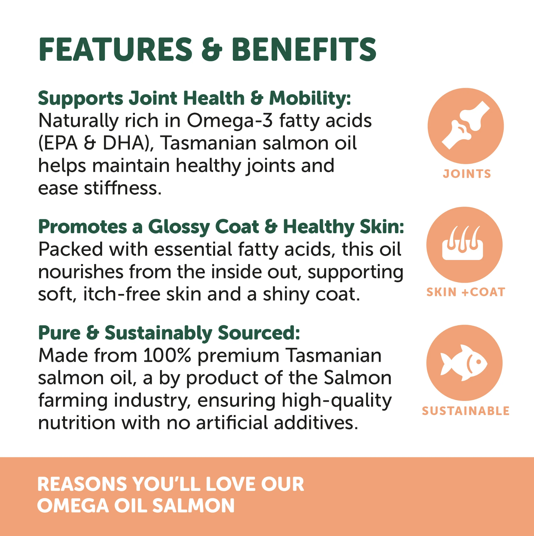 給你的寵物的關節提供應有的自然支撐! 天然動物解決方案鮭魚歐米茄油由100%純塔斯馬尼亞鮭魚油製成,富含歐米茄-3(EPA和DHA),有助於保持活動性,滋養皮膚,促進健康的毛髮。 對他們日常健康的簡單、自然的提升。