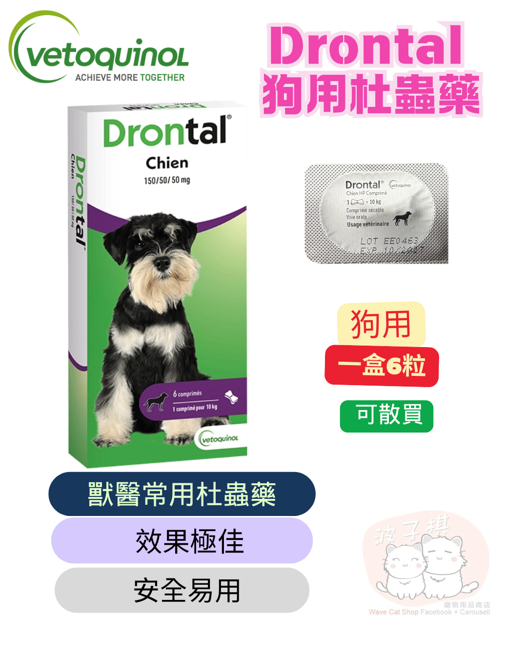 Vetoquinol Drontal Dog 狗驅蟲劑6片 Vetoquinol是一種有效的獸醫解決方案,可以對抗蛔蟲和絛蟲。 它治療感染了最常見的腸道寄生蟲的狗:蛔蟲、鉤蟲、鞭蟲和絛蟲。 這種6平板電腦的格式非常適合有多隻狗的家庭或確保全年持續保護。